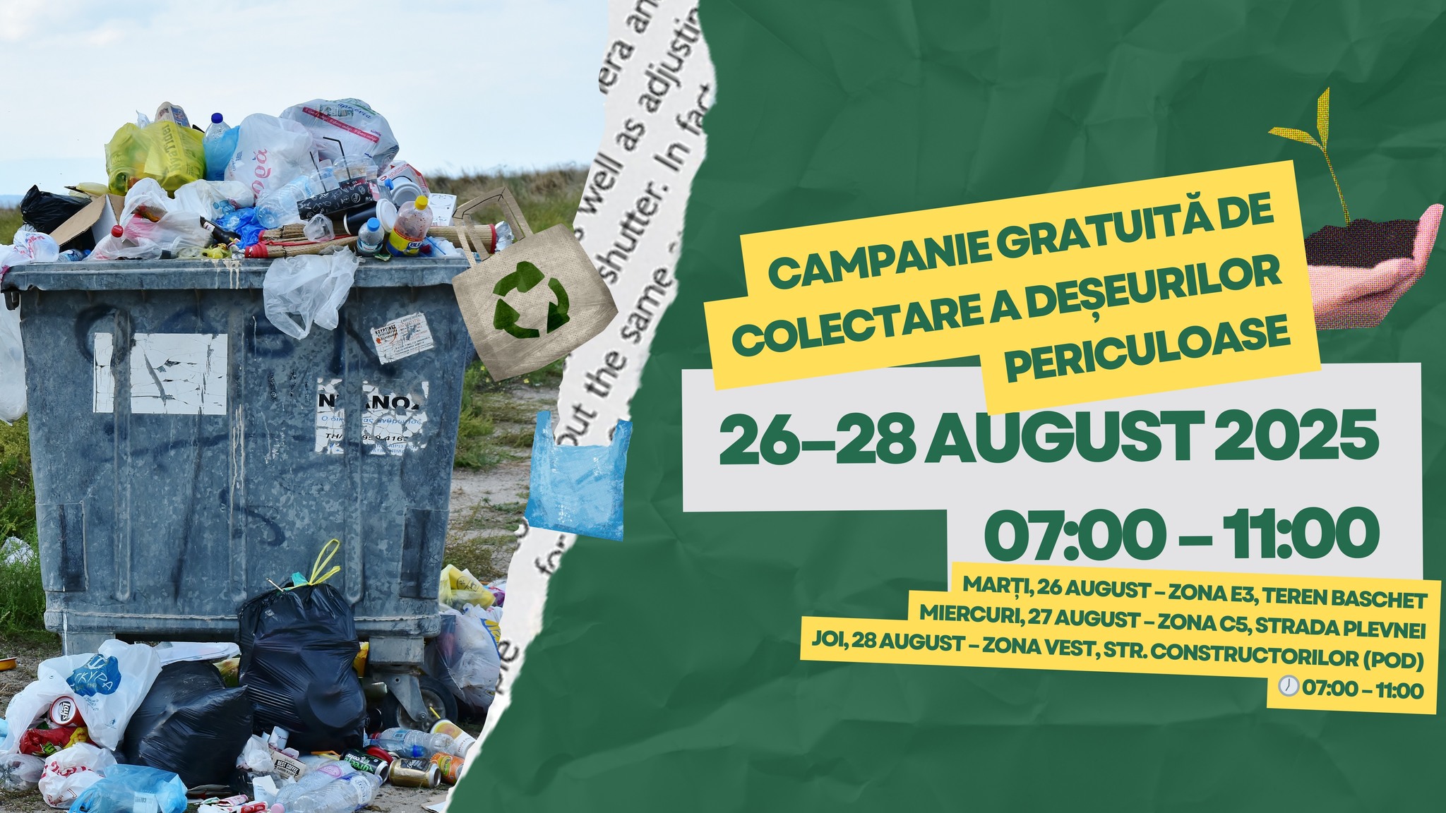 Ca viceprimar responsabil Andaluzia Luca îndeamnă cetățenii urbei să sprijine cât se poate de mult campania pe care Servicii Publice o desfășoară în aceste zile. „Reamintim tuturor cetățenilor din municipiul Tulcea că în perioada 26–28 august 2025, în intervalul 07:00 – 11:00, are loc Campania gratuită de colectare a deșeurilor periculoase menajere. Deșeurile care pot fi aduse în cadrul campaniei: Ambalaje de detergent și cosmetice; Soluții și spray-uri insecticide; Vopsele, lacuri, diluanți, adezivi; Becuri și surse de iluminat; Baterii și acumulatori (fără auto).