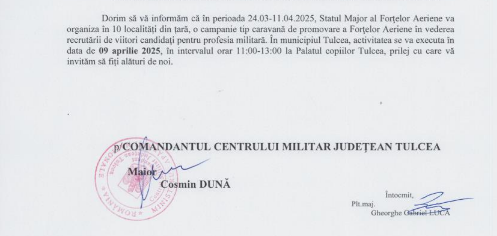 Centrul Militar Județean Tulcea va organiza săptămâna viitoare, pe 9 aprilie, în municipiu, o activitate de recrutare de viitori candidați pentru piloți militari. Avem avioane, dar nu avem piloți! Mai jos, cum sună anunțul CMJ: