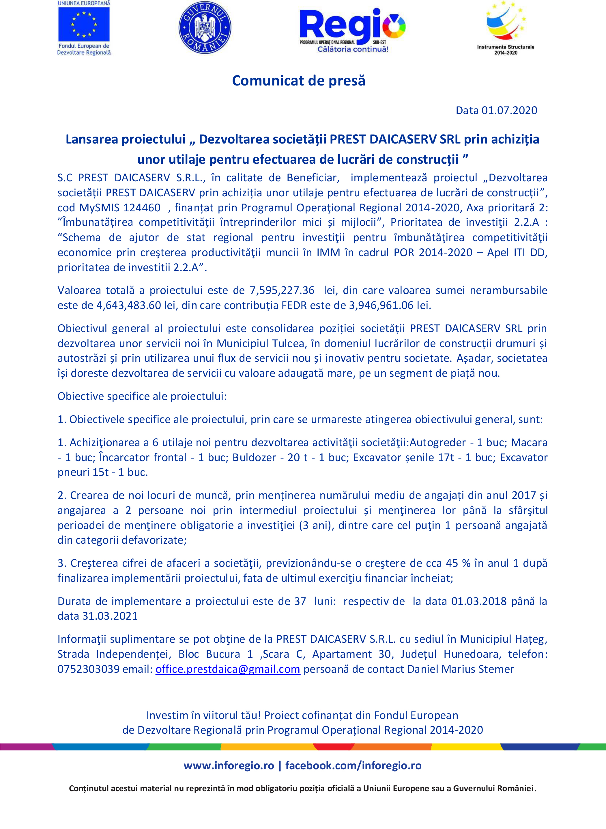 Lansarea proiectului „ Dezvoltarea societății PREST DAICASERV SRL prin achiziția unor utilaje pentru efectuarea de lucrări de construcții ”