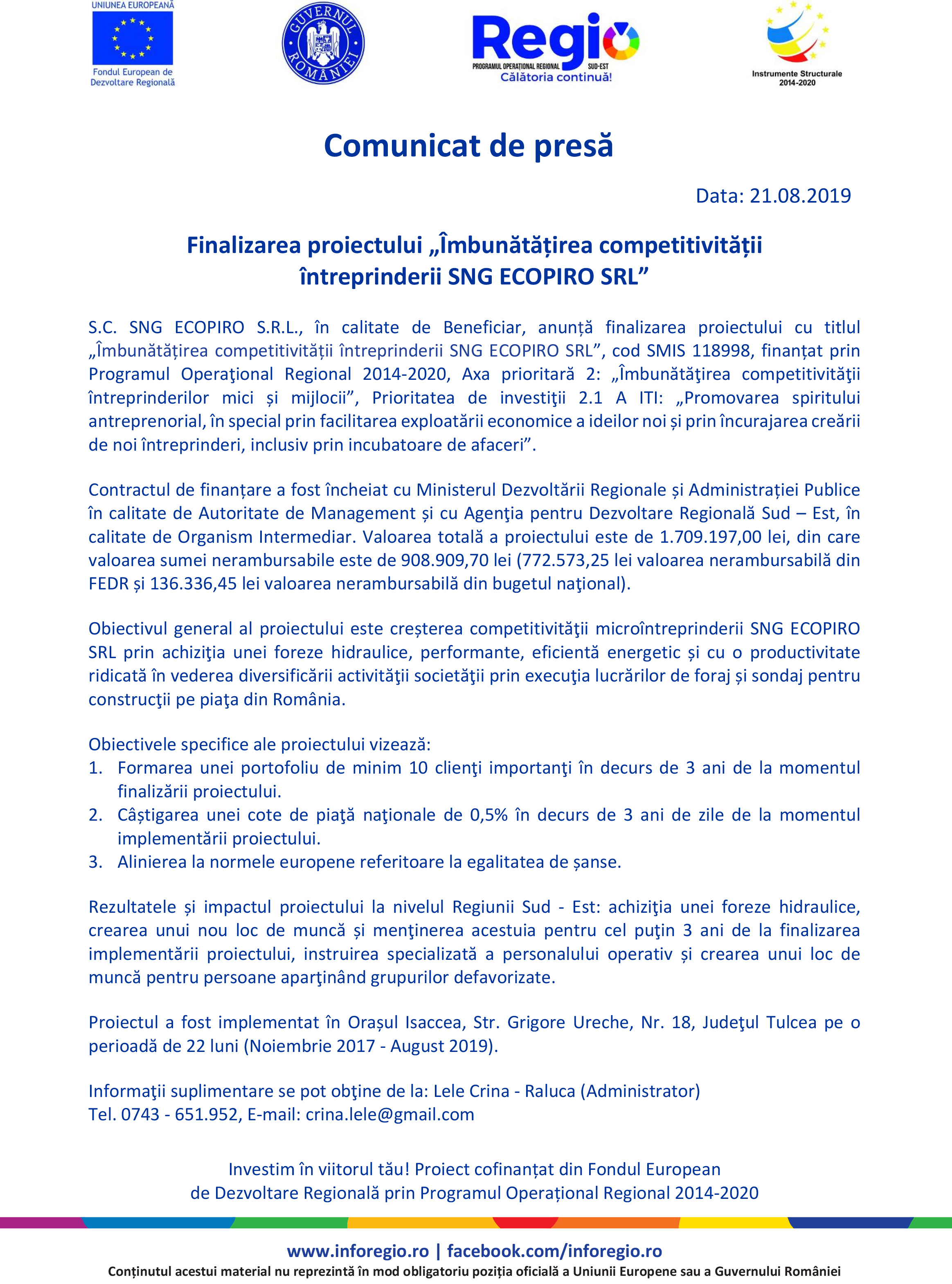Finalizarea proiectului „Îmbunătățirea competitivității întreprinderii SNG ECOPIRO SRL”