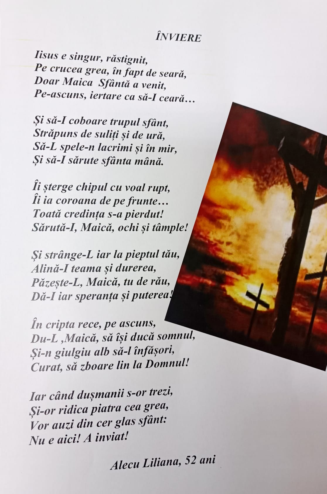 Mă numesc Alecu Liliana și lucrez la Biblioteca comunală Jijiila de 15 ani. O muncă frumoasă, la care, atunci când lucram la Școala Jijiila unde am fost secretară timp de 17 ani, visam doar. Nu-mi puteam închipui un loc de muncă mai frumos că cel de bibliotecar… să ai la discreție atâtea cărți! I-am dat dreptate scriitorului argentinian Jorge Luis Borges care își imagina raiul ca pe o bibliotecă… Ei bine, aici, în raiul meu, încerc să aduc cât mai mulți, in special copiii. Copiii noștri, atât de tentați de ,, amuzanta” tehnologie care le oferă, la un click, toate cele, și bune și rele, la grămadă, sunt principalii mei ,, clienți”! Pentru ei am încheiat parteneriate cu școala și încerc să -i aduc în lumea cărților și să -i fac sa înțeleagă cât au de pierdut dacă nu răsfoiesc o carte. Activități nenumărate in cei 15 ani, zile ale scriitorilor, expoziții de carte sau, pur și simplu, întâlniri în care doar citeam împreună. Sau vizite la micul muzeu al satului in care le prezentam obiectele, uneltele care făceau parte din viața bunicilor și străbunicilor. Pentru că latura aceasta a tradițiilor, a comorilor moștenite de la înaintașii noștri, m-am atras dintotdeauna… Încerc să promovez, atât cât pot, tot ceea ce are satul meu mai frumos: oamenii, copiii, tradițiile! Și azi, in prag de Înviere, am așternut câteva versuri care sa aducă smerenie, pocăință și iubire in suflet… Sărbători liniștite alaturi de cei dragi!