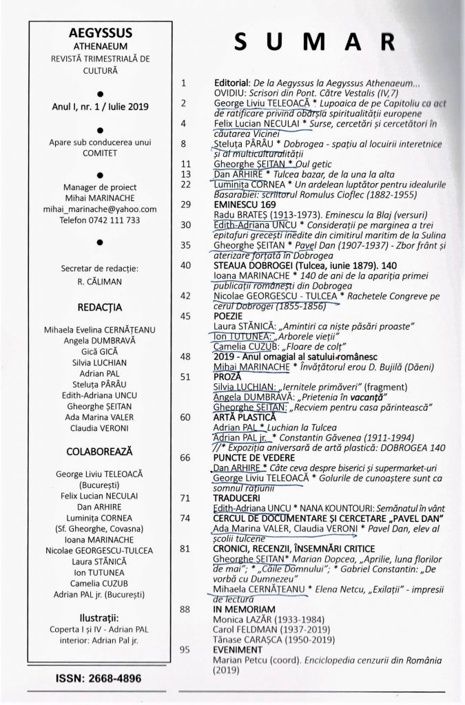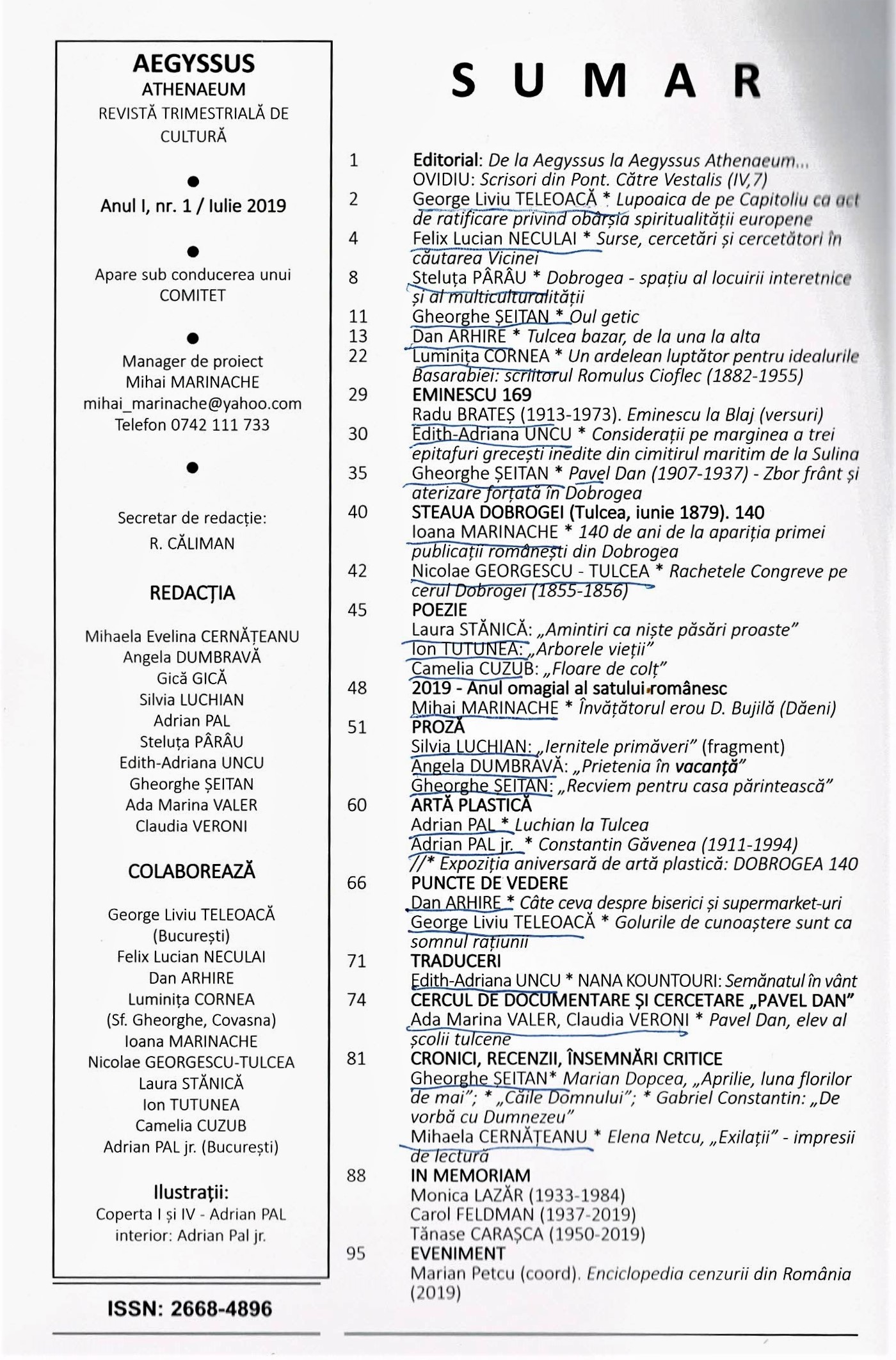 „Anul I, nr. 1, iulie 2019” este genul de mențiune întotdeauna dătătoare de speranțe! Aceasta, trecută în ghilimele, stă tipărită pe coperta noii reviste tulcene AEGYSSUS ATHENAEUM, cu explicația „Revistă trimestrială de cultură/ Tulcea”. Revista este rodul unui proiect al cărui manager este domnul profesor Mihai Marinache, așezat în fruntea „unui comitet care, din motive obiective ține să rămână învăluit în tăcere”, după cum însuși distinsul profesor menționează în editorialul intitulat „De la AEGYSSUS la AEGYSSUS ATHENAEUM/ În loc de program”! Iată, deci, un început de revistă plasat sub semnul misterului! Această revistă tulceană de cultură își propune să se axeze „pe cercetarea și valorificarea unor domenii încă destul de puțin puse în lumină: istoria locală, documente, presa ținutului, învățământ, carte veche, folclor, personalități, arte, cultură și, nu în ultimul rând, creație literară, traduceri, interviuri, dezbateri și puncte de vedere”.