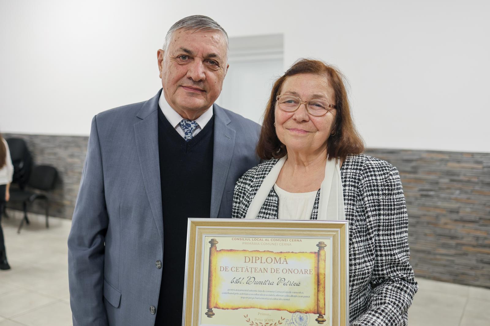 Sâmbătă, după-amiază, comuna Cerna a fost gazda unui eveniment cultural deosebit, încărcat de emoție și recunoștință: festivitatea de acordare a titlului de Cetățean de Onoare doamnei bibliotecară Dumitra Petrică și domnului profesor Mihai Marinache, două personalități care și-au pus amprenta, prin muncă și pasiune, asupra vieții culturale a comunității.