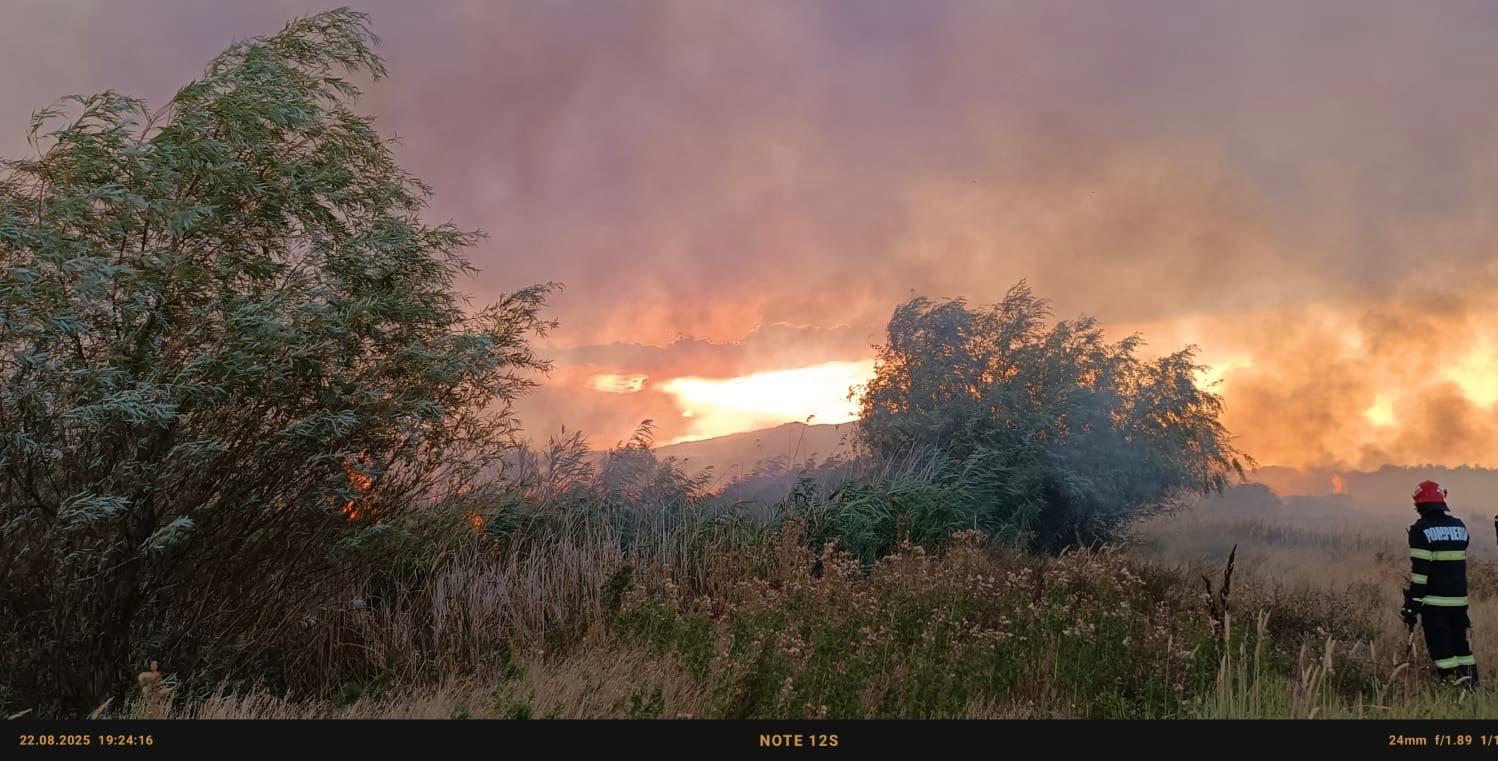 UPDATE. 22.08.2025. Ora 22,56. Incendiul a fost lichidat. Au ars în total aproximativ 25 de ha de vegetație uscată, stuficolă și liziera. Cauza probabilă, foc deschis în spații deschise.