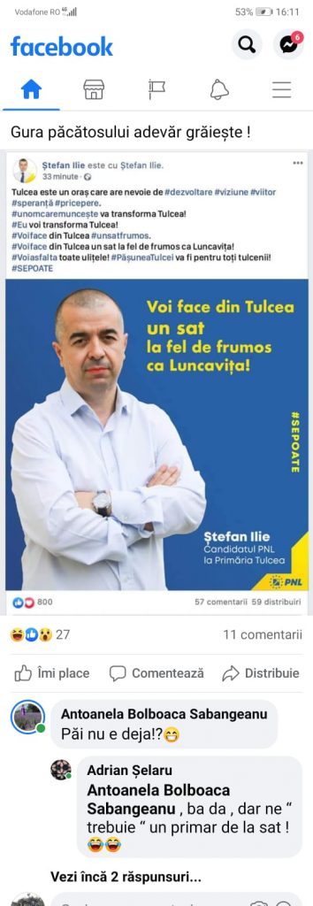 Ștefan Ilie, primarul comunei Luncavița: „Astăzi a apărut pe un grup facebook o fotografie trucată după un afis online prin care prezint ideile mele pentru un municipiu modern, dezvoltat si european.În acel afis sunt „ironizat” printr-o aluzie grosieră, de faptul că acum conduc o localitate rurală si, iată, există riscul ca orasul Tulcea să ajungă o comună neînsemnată.Nu mă mâhneste lipsa de judecată, de educatie sau înțelegere a celor care administreaza grupul – ei sunt cunoscuți, stie toată lumea cam ce le poate capul.Mă mâhneste faptul că, pentru ei, un sat românesc este nu un izvor de oameni sănătosi, cumpătați, apropiați de natură, de realitățile concrete ale vietii, de morala crestină si de etica bunului trai printre semeni ci, pesemne, o adunătură de golani, de neînsemnati ori aventurieri.