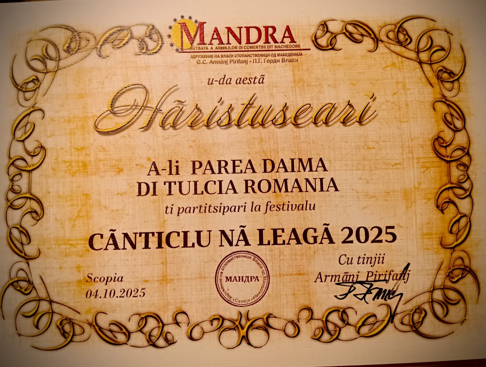 O punte între popoare și generații Festivalul de la Scopie nu a fost doar o competiție artistică, ci o sărbătoare a prieteniei între popoare, un loc unde diversitatea s-a împletit firesc cu unitatea, iar cântecul și dansul au devenit limbaj universal Participarea Comunității Armâne din Tulcea la festivalul din Macedonia de Nord a reprezentat mai mult decât o reușită artistică, a fost o dovadă vie a unității interetnice, a solidarității culturale și a puterii de a păstra vie flacăra identității armâne. Acești tineri artiști din Tulcea ne reamintesc că rădăcinile nu se uită, ci se poartă cu demnitate și mândrie.