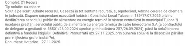 a dispus suspendarea executării Hotărârii Consiliului Local Tulcea privind renunțarea la sistemul local de distribuție a energiei termice. Precizez că suspendarea este o măsură provizorie și nu reprezintă anularea hotărârii. Personal aștept publicarea hotărârii complete și a motivării pentru a înțelege temeiurile juridice și justificarea acestei soluții. Până la comunicarea motivării, orice interpretare este prematură. Decizia Consiliului Local a fost fundamentată pe situația financiară critică a sistemului de termoficare, care înregistrează de ani de zile pierderi majore și nu mai poate fi susținut din bugetul local. Chiar și în contextul suspendării temporare, rămâne valabil faptul că nicio autoritate nu poate menține o activitate nesustenabilă în absența resurselor financiare necesare. Nicio hotărâre nu poate „crea bani” acolo unde nu există.